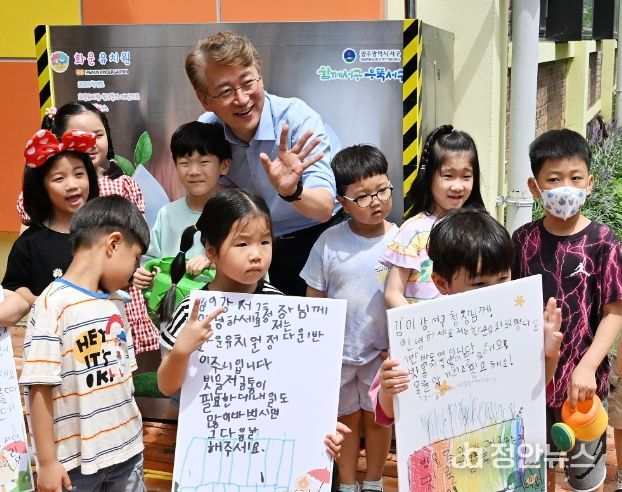 22일 유치원을 찾은 김이강 서구청장은 “물을 아껴서 상추와 딸기, 토마토, 완두콩을 기르고 싶다는 아이들의 착한 마음이 행정을 움직였다”며 “기후변화로 물 부족 현상이 심각해지고 있는 요즘 빗물저금통이 물 절약과 환경을 살리는 착한정책이 될 것이다”고 말했다.