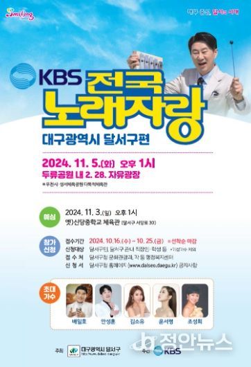 정안뉴스 안정주 기자 | 대구 달서구에서는 25일까지 노래와 댄스, 재치있는 입담을 갖춘 끼와 열정이 넘치는 구민들을 대상으로 'KBS 전국노래자랑' 참가 신청자를 모집한다.
