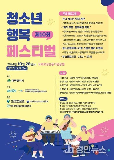 정안뉴스 안정주 기자 | 대구광역시가 주최하는 ‘제10회 청소년 행복페스티벌’이 10월 26일 오후 1시부터 ‘뭐가 됐든, 행복하면 됐지’라는 주제로 국채보상운동기념공원 화합의 광장 일대에서 개최된다.