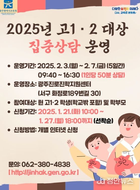 정안뉴스 기자 | 광주시교육청은 2025학년도를 맞아 고등학교 1·2학년을 대상으로 집중 진학상담을 실시한다.