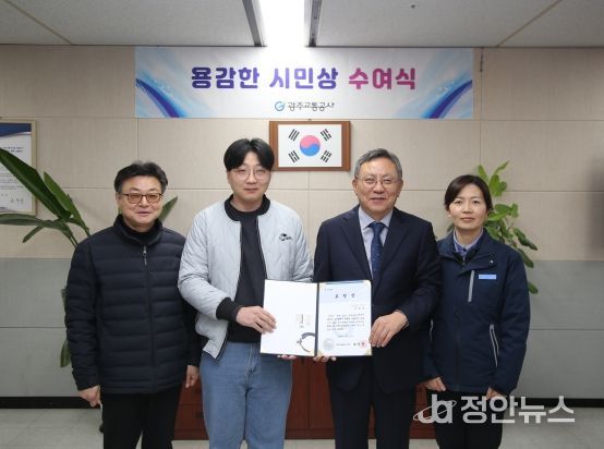 정안뉴스 기자 | 광주교통공사는 최근 역사 내 화재 발생 상황을 목격하고 즉시 진화에 나서 피해 확산을 막은 시민 전대성(35)씨에게‘용감한 시민상’을 수여했다고 밝혔다.