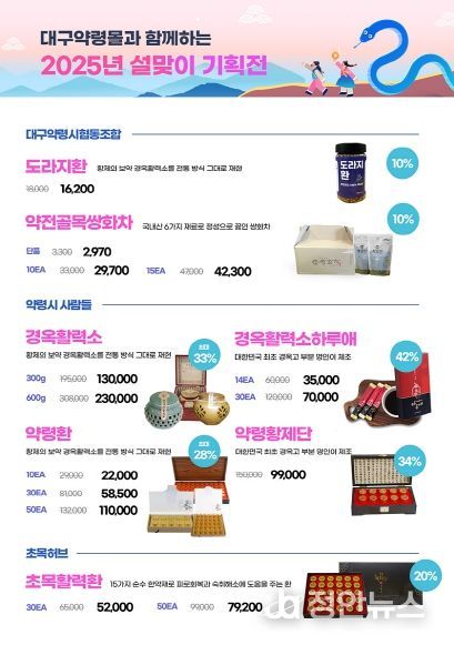 정안뉴스 안정주 기자 | 대구광역시는 민족 최대 명절인 설을 맞아 지역의 우수한 한방제품을 홍보하기 위해 약령시 내 ‘의료관광 전시판매장(중구 남성로 25, 1층)과 대구약령몰을 통하여 최대 50%까지 할인 판매하는 행사를 진행한다.
