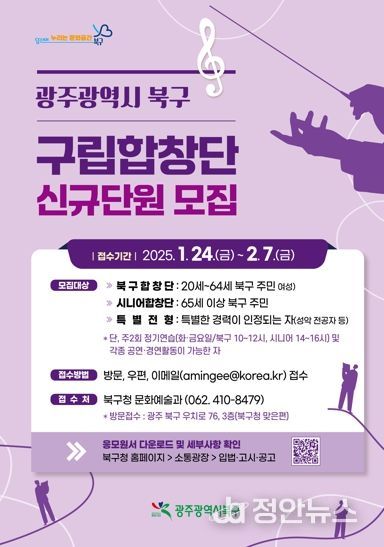 정안뉴스 기자 | 광주시 북구가 2025년 새해를 맞아 아름다운 목소리로 지역주민들과 소통하는 구립합창단(북구합창단, 시니어합창단) 신규 단원을 다음 달 7일까지 모집한다고 30일 밝혔다.