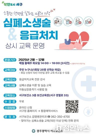 정안뉴스 기자 | 광주광역시 서구는 2월부터 서구 주민을 대상으로 심정지 등 응급상황 시 신속 대응을 위해 심폐소생술 상설교육 프로그램을 운영한다.
