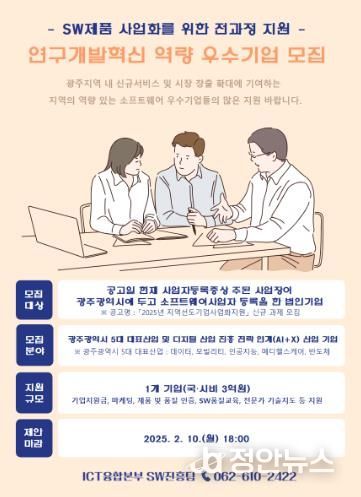 정안뉴스 기자 | 광주광역시와 광주정보문화산업진흥원은 ‘소프트웨어(SW) 융합 제품 서비스 개발 및 사업화 지원 사업’에 참여할 소프트웨어기업을 2월12일까지 모집한다.