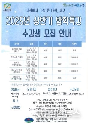정안뉴스 기자 | 광주광역시 서구가 3일부터 ‘세상에서 가장 큰 대학, 서구’ 2025년 상반기 방학 특강에 참여할 수강생을 모집한다.