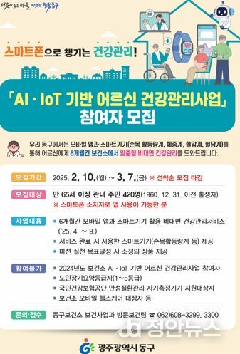 정안뉴스 기자 | 광주 동구는 오는 10일부터 AI(인공지능)·IoT(사물인터넷) 기반 어르신 건강 관리 사업 대상자를 선착순 모집한다고 밝혔다.