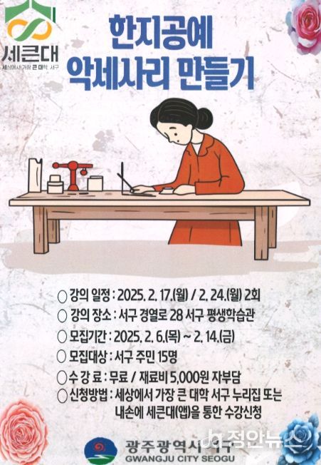 정안뉴스 기자 | 광주광역시 서구는 주민들의 학습 수요를 충족시키고 양질의 교육을 제공하기 위해‘세상에서 가장 큰 대학, 서구’ 우리동네 일타강사의 두 번째 프로그램 수강생을 모집한다.