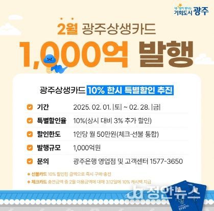 정안뉴스 기자 | 광주시가 1월에 이어 2월에도 ‘광주상생카드 10% 특별할인’을 시행한다. 고금리‧고물가 여파에 탄핵 정국까지 겹치면서 위축된 지역경제에 활력을 불어넣을 것으로 기대된다.