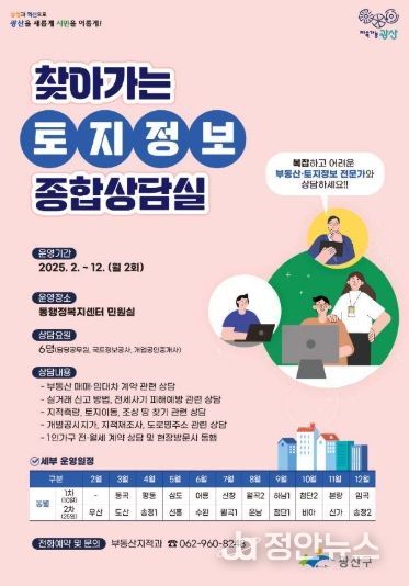 정안뉴스 기자 | 광주 광산구가 25일부터 매월 2회 전문가들과 함께 마을로 찾아가는 토지 정보 종합상담실을 운영한다고 밝혔다.