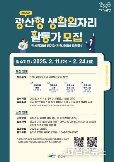 광산형 생활일자리 활동은 생활민원 해결, 공공사업 인력 지원 등 총 37개 사업에 참여하며 광산구에 거주하는 미취업자를 대상으로 3월부터 6월까지 4개월 동안 활동할 150명을 모집한다. 참여 수당 일부는 온누리상품권으로 지급한다.
