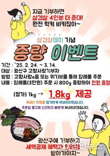 광산구는 이벤트 동안 광산구 고향사랑기부자를 대상으로 삼겹살을 선택할 경우, 기존 1㎏에서 800g 증량한 1.8㎏을 제공한다.