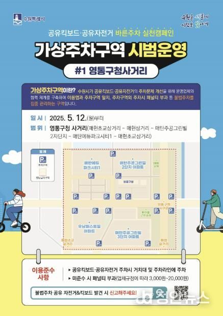 정안뉴스 안정주 기자 | 수원시가 5월 12일부터 영통구청 사거리 일원에서 ‘공유 자전거·킥보드(PM) 가상 주차 구역’을 시범 운영한다.