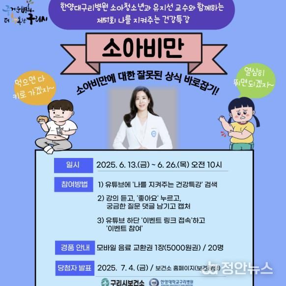 정안뉴스 안정주 기자 | 구리시는 오는 13일 ‘소아비만’을 주제로 한양대학교구리병원 소아청소년과 유지선 교수와 함께하는 나를 지켜주는 건강특강을 구리시 공식 유튜브 채널(구리비전)을 통해 송출한다고 밝혔다.