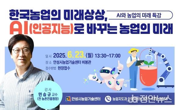 정안뉴스 안정주 기자 | 안성시농업기술센터는 오는 6월 23일 오후 1시 30분부터 5시까지 ‘AI가 바꾸는 농업의 미래’를 주제로 한 특강을 안성시농업기술센터 비봉관(보개원삼로 219)에서 진행한다고 밝혔다.