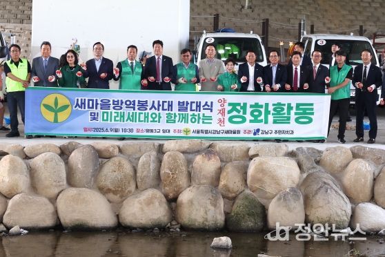 정안뉴스 안정주 기자 | 꿈이 모이는 도시, 미래를 그리는 강남구가 강남구 새마을회(지회장 이종선)와 함께 6월 9일 양재천 영동3교에서 ‘2025년 새마을 방역봉사대 발대식’과 ‘어린이와 함께하는 양재천 정화행사’를 열었다.