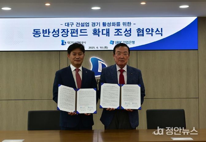 정안뉴스 안정주 기자 | 대구도시개발공사는 10일 IBK기업은행과 대구 건설업 경기 활성화를 위한 동반성장펀드 확대 조성 협약을 체결했다.