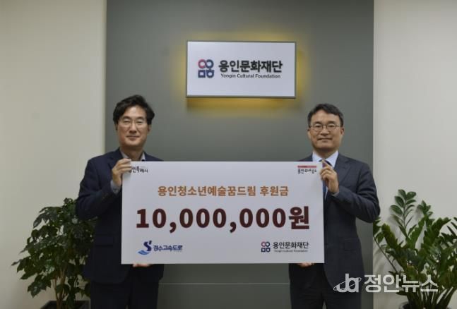 정안뉴스 안정주 기자 | 용인문화재단은 지난 13일 경수고속도로㈜로부터 ‘용인청소년예술꿈드림’ 장학사업 지원을 위한 후원금 1,000만 원을 기탁받았다고 밝혔다.