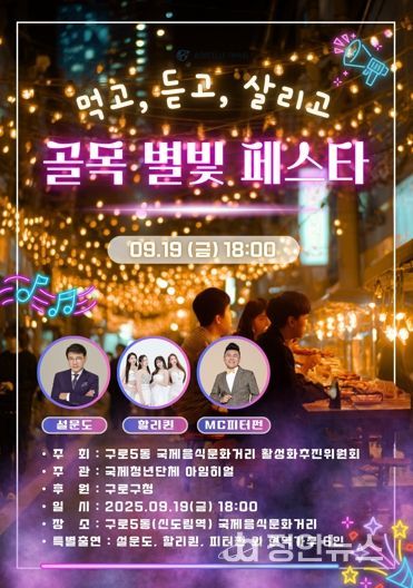 정안뉴스 안정주 기자 | 구로구가 9월 19일 구로5동 새말로16길 국제음식문화거리에서 ‘골목별빛 페스타 – 먹고, 듣고, 살리고!’를 연다. 이번 행사는 구로5동 국제음식문화거리 활성화 추진위원회가 주최하며, 오후 6시부터 9시까지 약 3시간 동안 다양한 볼거리와 즐길 거리를 제공할 예정이다.