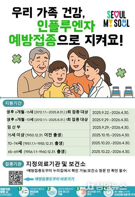 정안뉴스 안정주 기자 | 서울시는 다가오는 겨울철 인플루엔자 유행에 대비해 시민 건강 보호에 나선다. 시는 오는 22일부터 내년 4월 30일까지 ▴어린이 ▴임신부 ▴65세 이상 어르신을 대상으로 연령대별 순차 무료 예방접종을 시행한다. 접종은 대상·연령별로 시기를 분산해 쏠림을 방지하고, 보다 안전한 접종을 유도할 계획이다.