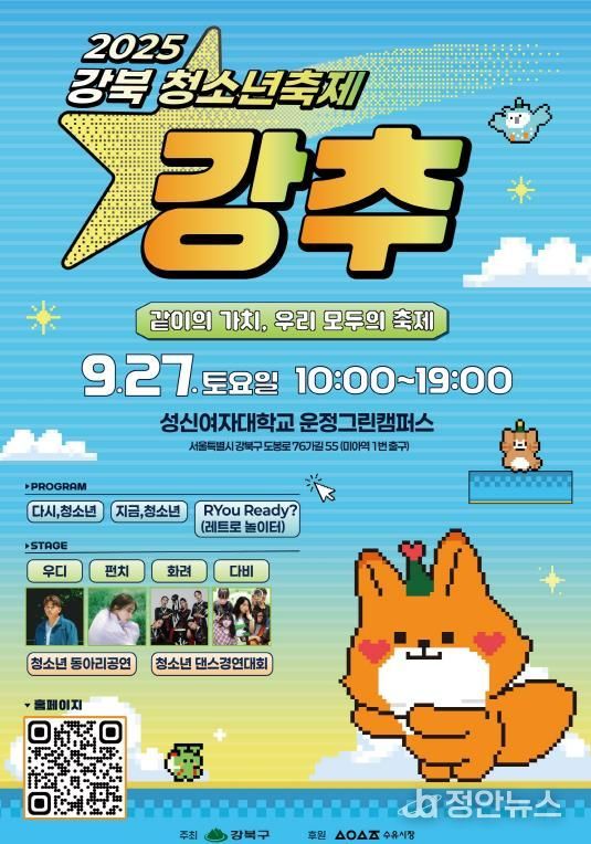 정안뉴스 안정주 기자 | 서울 강북구는 오는 9월 27일 오전 10시부터 오후 7시까지 성신여자대학교 미아운정그린 캠퍼스 광장에서 ‘2025 강북 청소년축제 강추’를 개최한다.