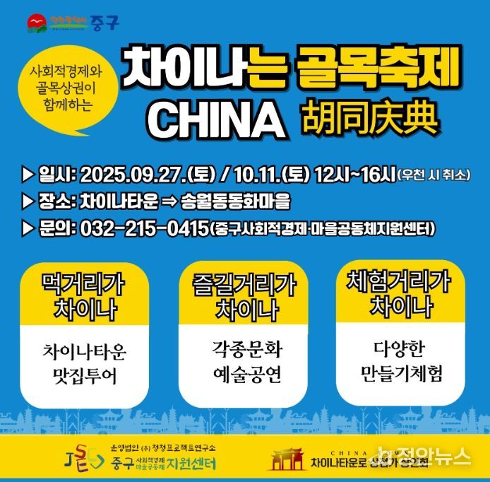 정안뉴스 안정주 기자 | 인천 중구 사회적경제·마을공동체 지원센터는 올해 9월부터 11월까지 인천 차이나타운·동화마을 일원에서 ‘2025년도 사회적경제와 골목상권이 함께하는 '차이나는 골목축제'’를 개최한다고 25일 밝혔다.