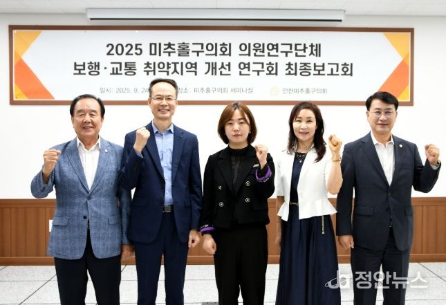 정안뉴스 안정주 기자 | 인천광역시 미추홀구의회 의원연구단체 '보행·교통 취약지역 개선 연구회'(대표의원 박수연, 연구의원 장규철·배상록·김태계)가 2025년 9월 24일 미추홀구의회 세미나실에서 연구용역 최종보고회를 개최하고 성공적으로 마무리했다.