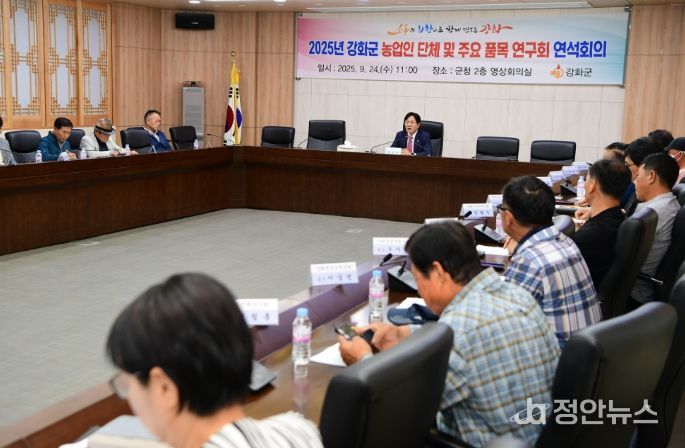 정안뉴스 안정주 기자 | 강화군은 지난 24일 관내 농업인 단체장과 주요 품목 연구회 대표들과 함께 연석회의를 열고, 가을철 수확기를 맞은 농산물의 고품질 유지와 농업 발전 방안을 모색했다.