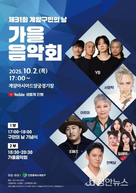 정안뉴스 안정주 기자 | 인천광역시 계양구는 ‘제31회 계양구민의 날’을 맞아 오는 10월 2일(목) 오후 5시부터 계양아시아드양궁경기장에서 기념식과 가을음악회를 개최한다고 밝혔다.