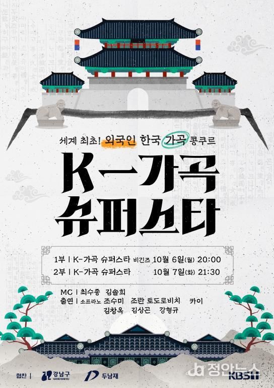 정안뉴스 안정주 기자 | 꿈이 모이는 도시, 미래를 그리는 강남구가 개청 50주년을 맞아 한국 가곡의 아름다움을 세계 무대에 알리는 글로벌 경연 'K-가곡 슈퍼스타'를 후원한다. 이번 행사는 오는 9월 30일 오후 7시 여의도 KBS홀에서 열리며, 전 세계 11개국 13명의 외국인 성악가가 무대에 올라 한국 가곡을 선보인다.