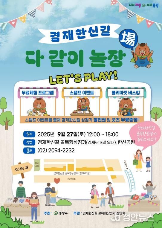 정안뉴스 안정주 기자 | 중랑구는 오는 9월 27일, 겸재한신길 골목형상점가(겸재로3길 일대)와 한신공원에서 ‘겸재한신길 다 같이 놀장(場)’ 축제를 개최한다.