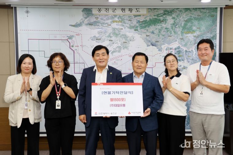 정안뉴스 안정주 기자 | 옹진군은 지난 25일, ㈜대일유통(대표 박경서)으로부터 지역사회를 위한 나눔활동의 일환으로 쌀 600포(10kg 기준)를 기탁받아 이웃돕기 성품 기탁식을 진행했다고 밝혔다.