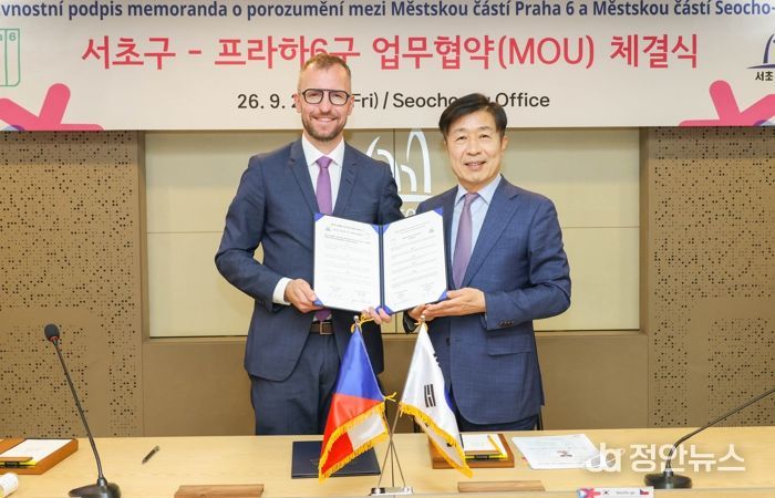 정안뉴스 안정주 기자 | 서울 서초구는 지난 26일 구청 5층 대회의실에서 체코 프라하 6구와 문화, 예술, 교육 분야 등 상호 교류 우호증진을 위한 우호도시협정 양해각서(MOU)를 체결했다고 밝혔다.