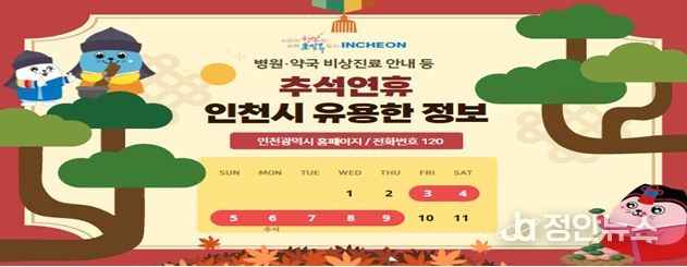 정안뉴스 안정주 기자 | 인천광역시는 추석 연휴(10월 3일~9일)를 맞아 시민들이 안전하고 편안한 명절을 보낼 수 있도록 물가안정, 교통, 성묘, 응급의료 등 12개 분야에 걸친 세부 대책을 마련하고 연휴 기간 종합상황실을 운영한다고 밝혔다.