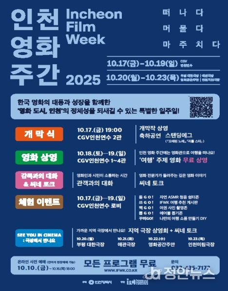 인천시가 주최하고 인천시영상위원회가 주관하는 이번 ‘인천 영화 주간 2025’는 ‘여행’을 주제로 10월 17일부터 23일까지 인천 전역에서 개최되며, 영화 도시 인천의 정체성을 새롭게 발견하고 시민 누구나 함께 즐길 수 있는 복합 영화 축제다.