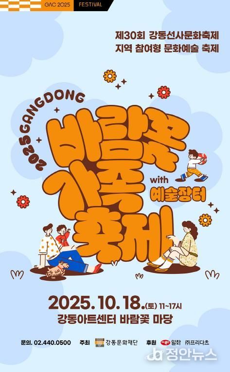 정안뉴스 안정주 기자 | 강동문화재단은 오는 10월 18일 오전 11시부터 오후 5시까지, 강동아트센터 바람꽃마당에서 '2025 강동 바람꽃 가족 축제 · 예술장터'를 개최한다고 밝혔다.