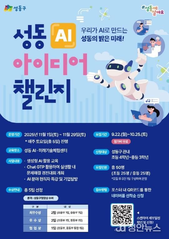 정안뉴스 안정주 기자 | 서울 성동구는 생성형 인공지능(챗GPT)을 활용해 일상 속 문제를 해결할 아이디어를 발굴하는 '2025 성동 AI 아이디어 챌린지'를 오는 11월 한 달간 운영하고, 참가자를 10월 25일까지 선착순 모집한다고 밝혔다.