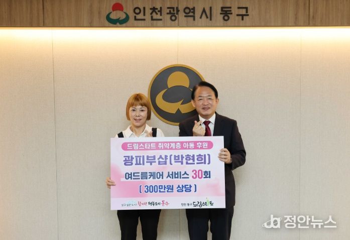 정안뉴스 안정주 기자 | 인천 동구와‘광피부샵’(대표 박현희)은 지난 29일 구청 접견실에서 관내 드림스타트 아동을 위해 300만원 상당의 여드름 케어 서비스를 후원하는 기탁식 열었다고 밝혔다.