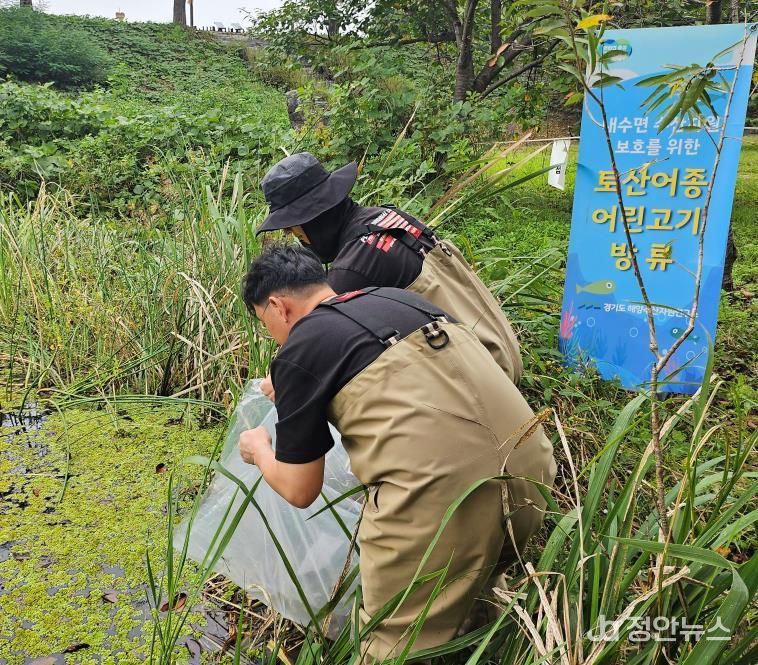 정안뉴스 안정주 기자 | 경기도해양수산자원연구소가 토종 민물고기 종 보존과 하천 생태계 복원을 위해 경기도 보호 어종인 버들붕어 치어 1천 마리를 9월 30일 광주시 경안천습지생태공원에 방류했다.