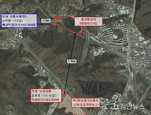실제 평가대상지와 환경이 유사하고 약 270m 거리에 위치한 상적동 거래사례를 기준으로 할 경우 ㎡당 약 55만2000원 수준으로 산정될 수 있었으나, 금토동 토지를 적용하면서 평균 94만2000원이 책정돼 큰 차이가 발생했다. 또한 이번 감정평가에서는 ‘유지’를 평가하면서 농지 가격을 그대로 기준가격으로 적용했으나, 유지와 농지의 가격 비율을 0.5로 산정한 타 지자체 사례(국민권익위원회 의결)를 준용할 경우 최대 756억원까지 과대 평가됐을 것으로 추정된다.