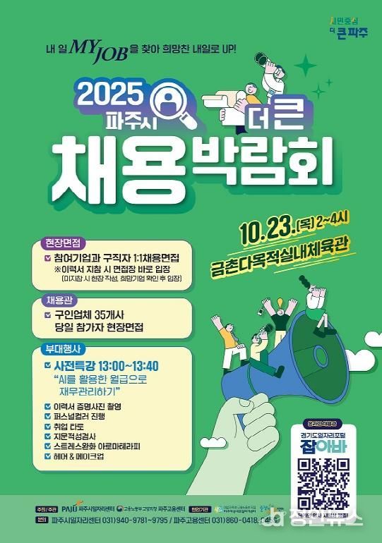 정안뉴스 안정주 기자 | 파주시는 오는 10월 23일 금촌다목적실내체육관 2층에서 ‘2025년 파주시 더 큰 채용박람회’를 개최한다고 밝혔다. 이에 앞서 행사에 참여할 구직자를 10월 1일부터 17일까지 모집한다.