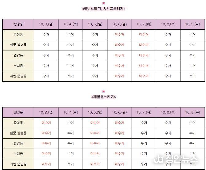 생활폐기물 수거는 일반 쓰레기의 경우 3일, 4일, 5일, 8일, 9일에, 재활용 쓰레기는 4일, 7일, 8일, 9일에 각각 수거된다.