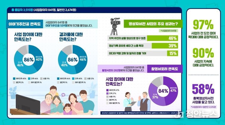 도는 지난 9월 1일부터 14일까지 2주간 실시한 ‘2025년 충북영상자서전 사업인지도 및 만족도’ 조사 결과를 발표하면서 “콘텐츠 제작 2만 5천 건을 돌파한 양적 성장에 이어 이제는 질적 성장도 입증됐다”고 밝혔다.