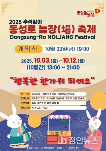 정안뉴스 안정주 기자 | 대구 중구는 10월 3일부터 12일까지 10일간 동성로 보행자전용도로 일원에서 ‘동성로에서 놀며 장보자!’라는 테마로 ‘2025 추석맞이 동성로 놀장(場) 축제’를 개최한다.