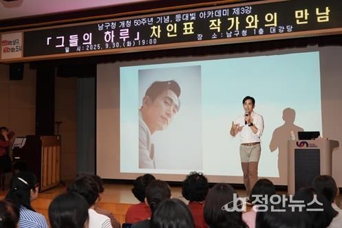 정안뉴스 황정혜 기자 | 부산 남구는 지난 9월 30일 남구청 개청 50주년을 맞이해, 구청 1층 대강당에서 '제20기 등대빛 아카데미' 3강으로 배우 겸 작가 차인표 씨를 초청해 특별강연을 열었다.