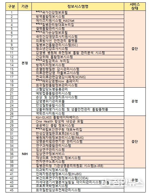 질병관리청은 총 45개의 정보시스템을 운영 중이며, 이 중 국가정보자원관리원에 입주한 방역통합정보시스템, 질병보건통합관리시스템, 질병관리청 대표누리집 등 32개 정보시스템이 중단된 상태라고 알렸다.