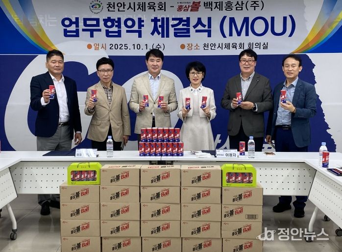 정안뉴스 황도연 기자 | 천안시체육회는 지난 1일 백제홍삼㈜와 체육인 건강증진을 위해 업무협약을 체결했다고 밝혔다.