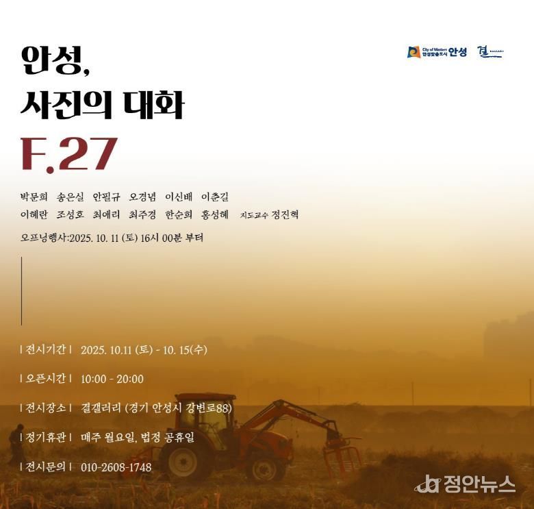 정안뉴스 안정주 기자 | 안성시 사진동아리 F.27 photo가 오는 10월 11일부터 15일까지 안성천 작은미술관 결갤러리에서 전시회 ‘안성, 사진의 대화 F.27’을 개최한다. 이번 전시는 동아리 회원 18명이 참여해 안성의 자연환경과 사람들의 이야기를 기록한 작품을 선보인다.