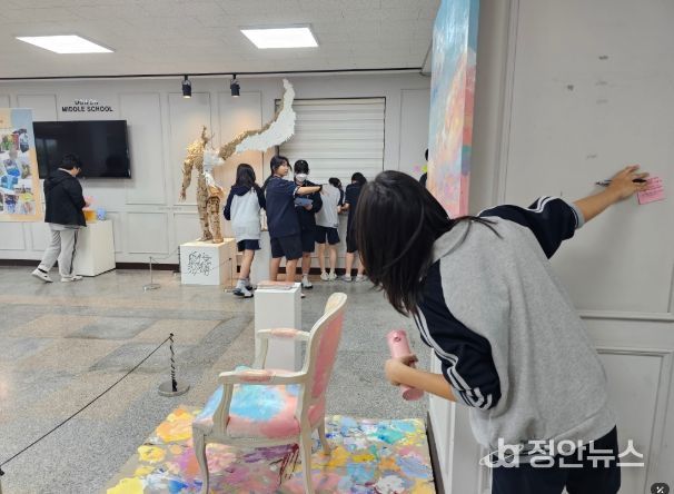 도원중 권혜진 교사는 “학교 중앙 현관이 마치 미술관을 옮겨온 듯한 착각이 든다. 수시로 지나가는 곳에서 작품을 감상하며 학생들의 심미적 감성 역량을 신장시키는 기회가 되고 있다.”며 감사의 말을 전했다.