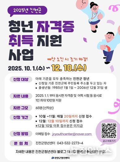 정안뉴스 황은경 기자 | 충북 진천군 청년센터는 10월부터 청년들의 직무 역량 강화와 진로 설계를 돕고 경제적 부담을 완화하기 위해 ‘청년 자격증 취득 지원사업’을 본격 시행한다고 9일 밝혔다.